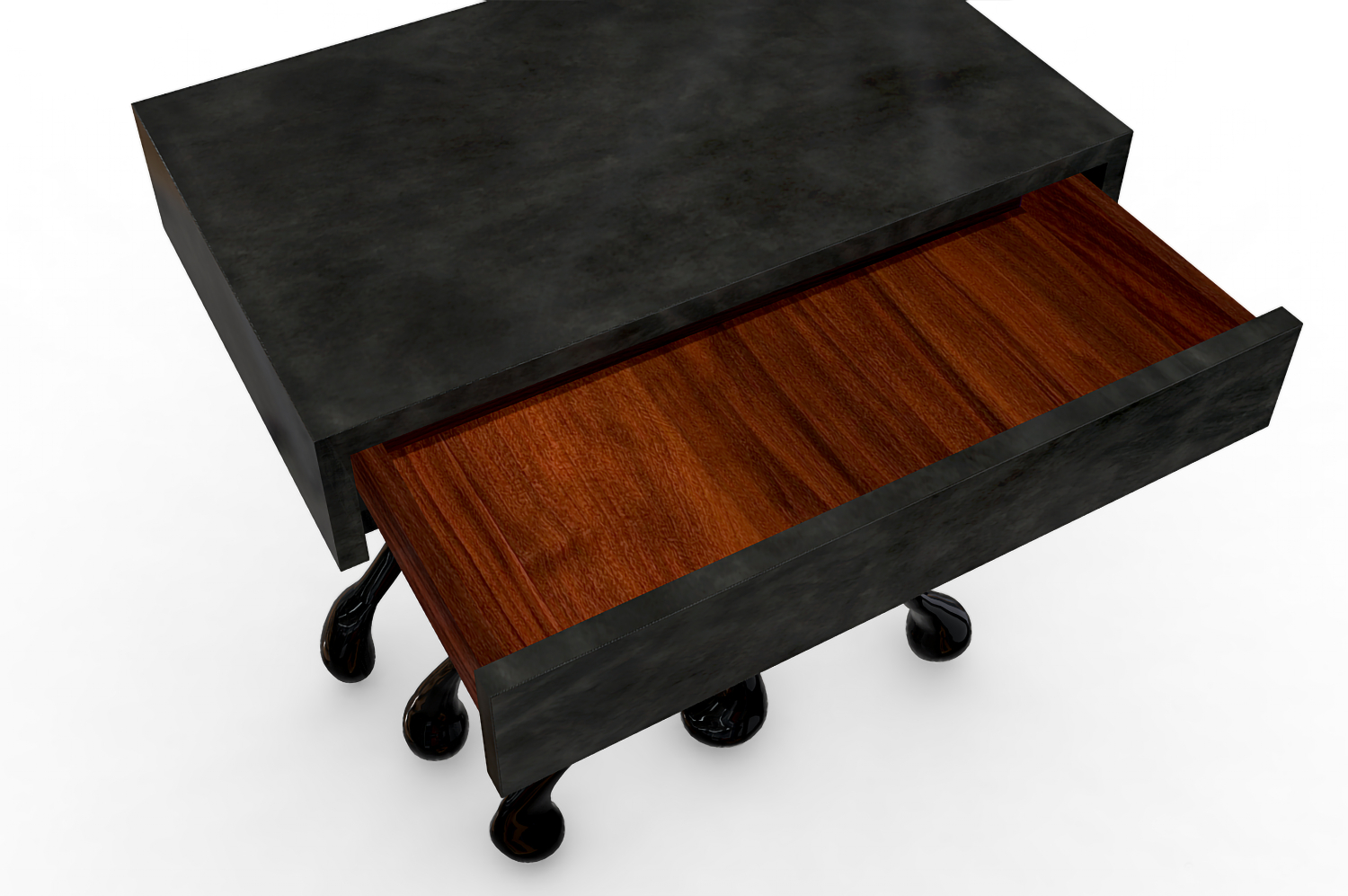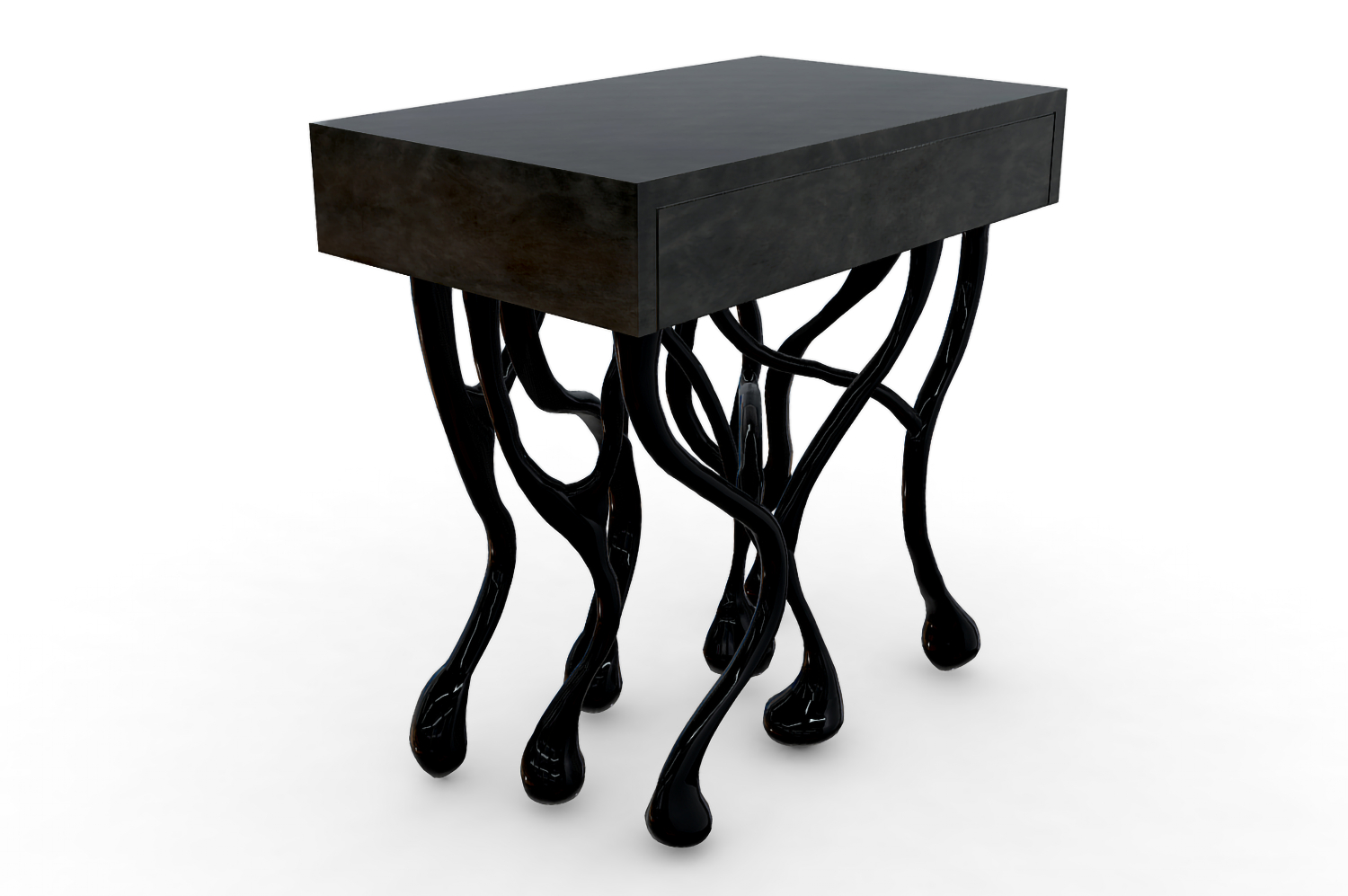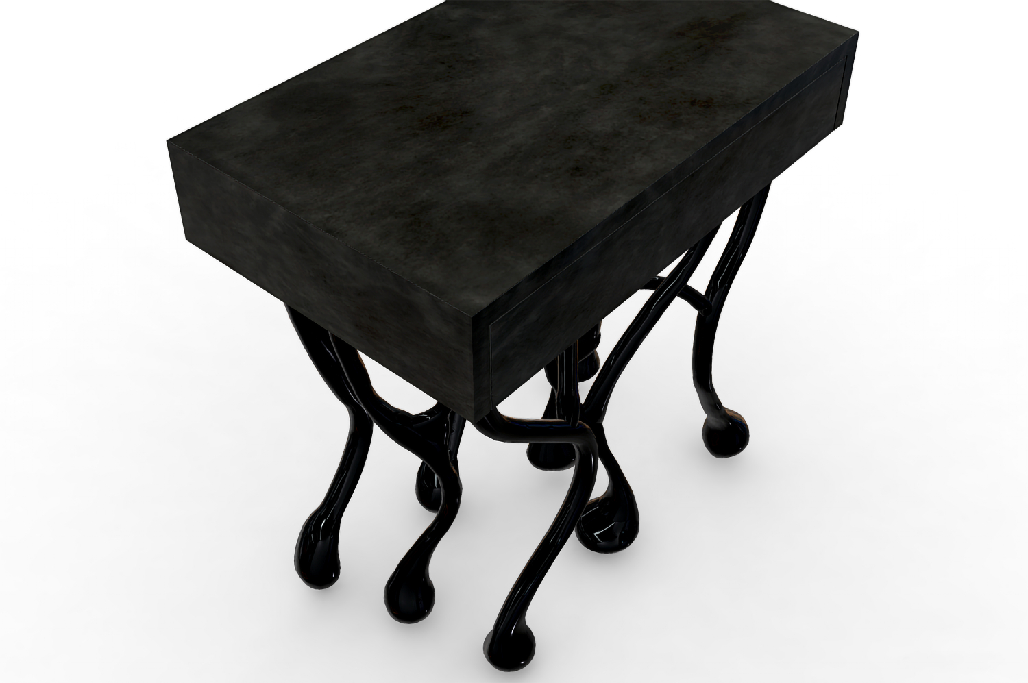 Immerse your space in the allure of sculptural design with our artistically shaped table. Intertwining legs, polished to perfection, showcase a true piece of art. Charcoal-color parchment tops further propel this table into a category of uniqueness, defining your space with unmatched style and sophistication.