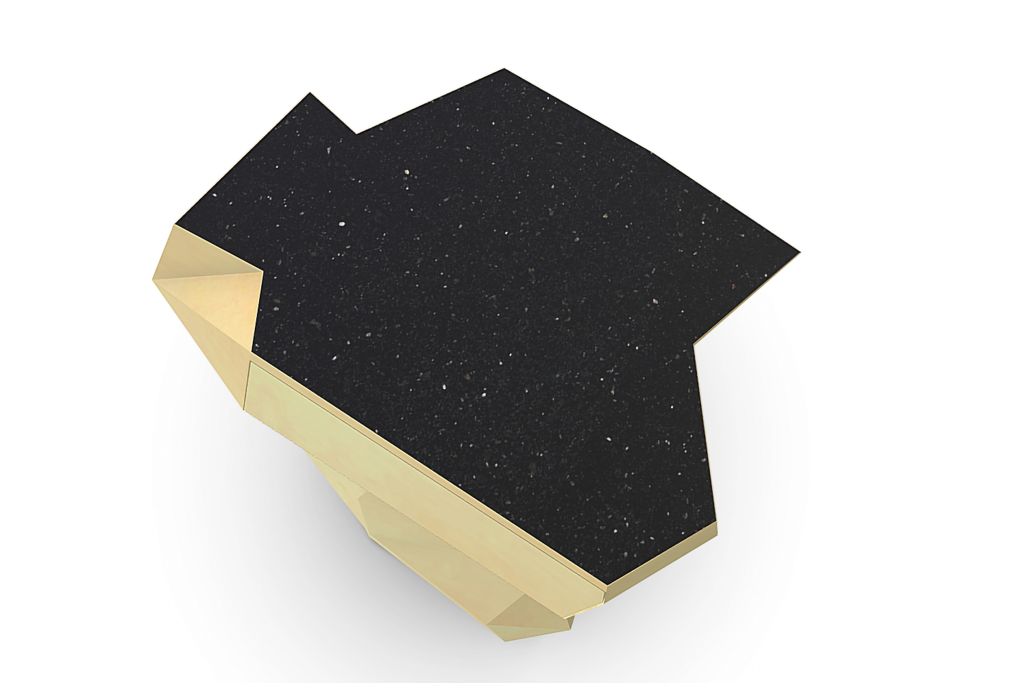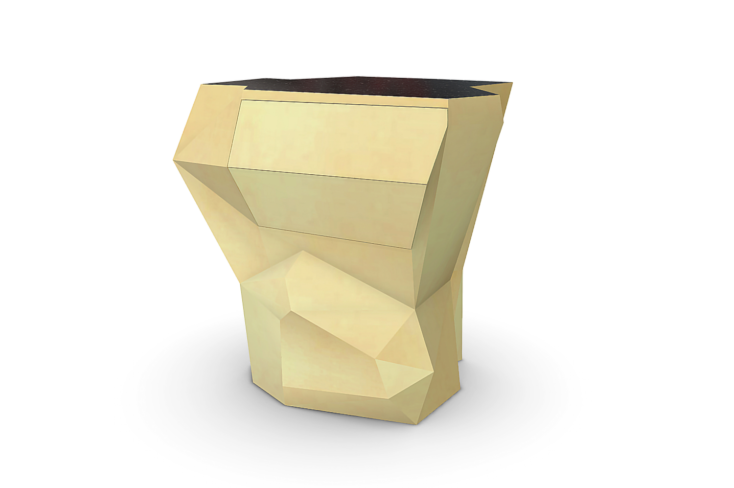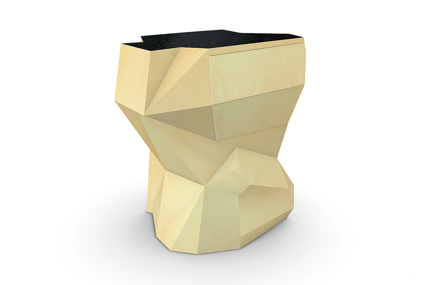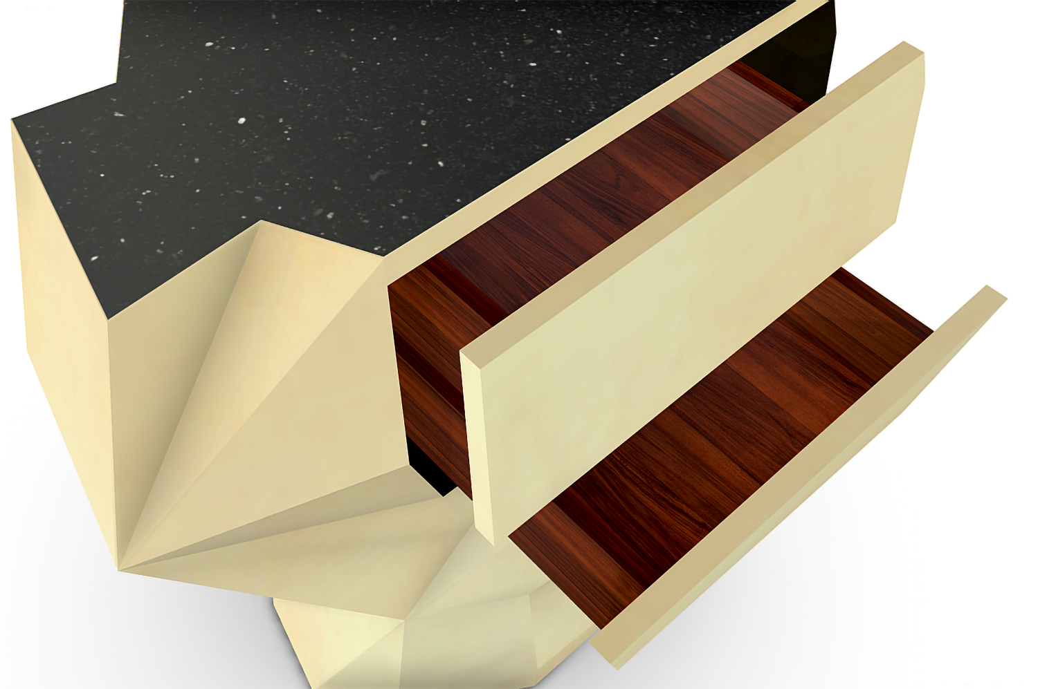 Transform your space with our geometrically shaped side table, inspired by an amethyst rock. natural-color parchment with granite tops polished to perfection, this stunning piece features two mahogany drawers finished in a rich, glossy color, combining modern aesthetics with timeless sophistication.